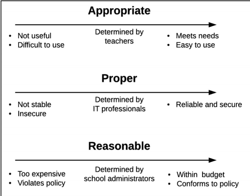 It system that fail to have these characteristics will be ineffective in schools; if they are identified as not meeting any one of these, then school IT managers must change how they function and are used so they become appropriate, proper, and reasonable.