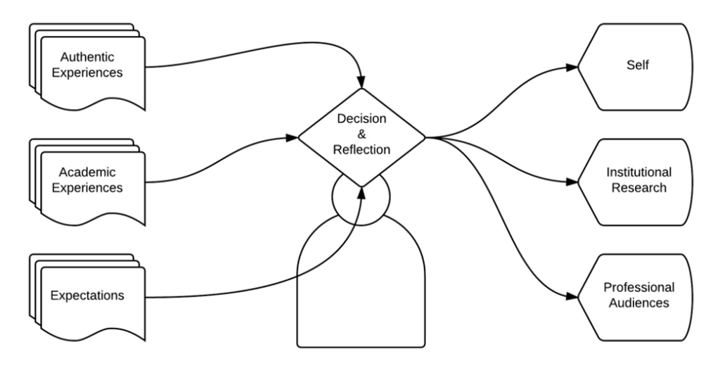 Portfolios comprise three inputs: authentic experiences, academic experiences, and expectations. Expectations communicate to the creator which skills, knowledge, and habits are important and contributes to the organization of the portfolio through providing labels for tabs, pages, or sections. In school settings, artifacts academic experiences from the formal curriculum contribute to the portfolio, but artifacts from complex and authentic experiences are most-frequently included.