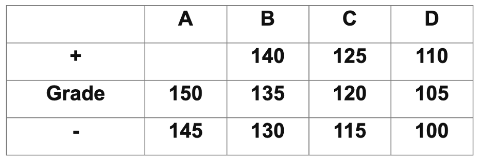 1) Students earn “Course Points” for completing assignments my classes. The letter grades I report for students are based on the number of these they earn and they know in advance how many Course Points are needed for any grade. Figure 1 is an example for the course I am currently teaching. Students need 100 Course Points to pass, and 150 to have an A on their transcript.