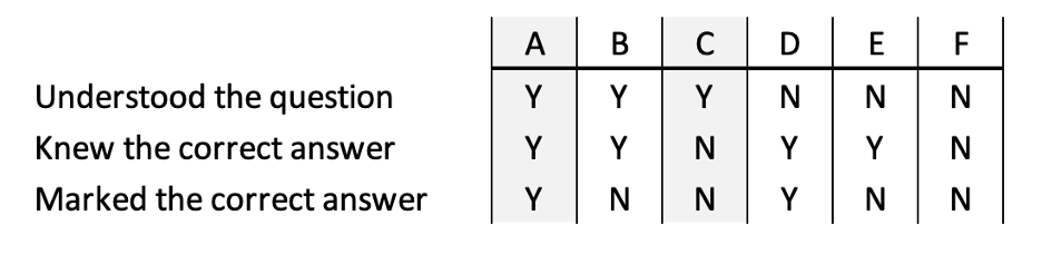 You can see in the table, columns A and C are the cases we assume to reflect the state of affairs” Students comprehend the question, and accurately mark their answer. (I am ignoring the potential that the teacher accurately knows the answer and recognizes it. Of course, I am hopeful they are using an automated quiz tool, but let’s focus only on the student here.)